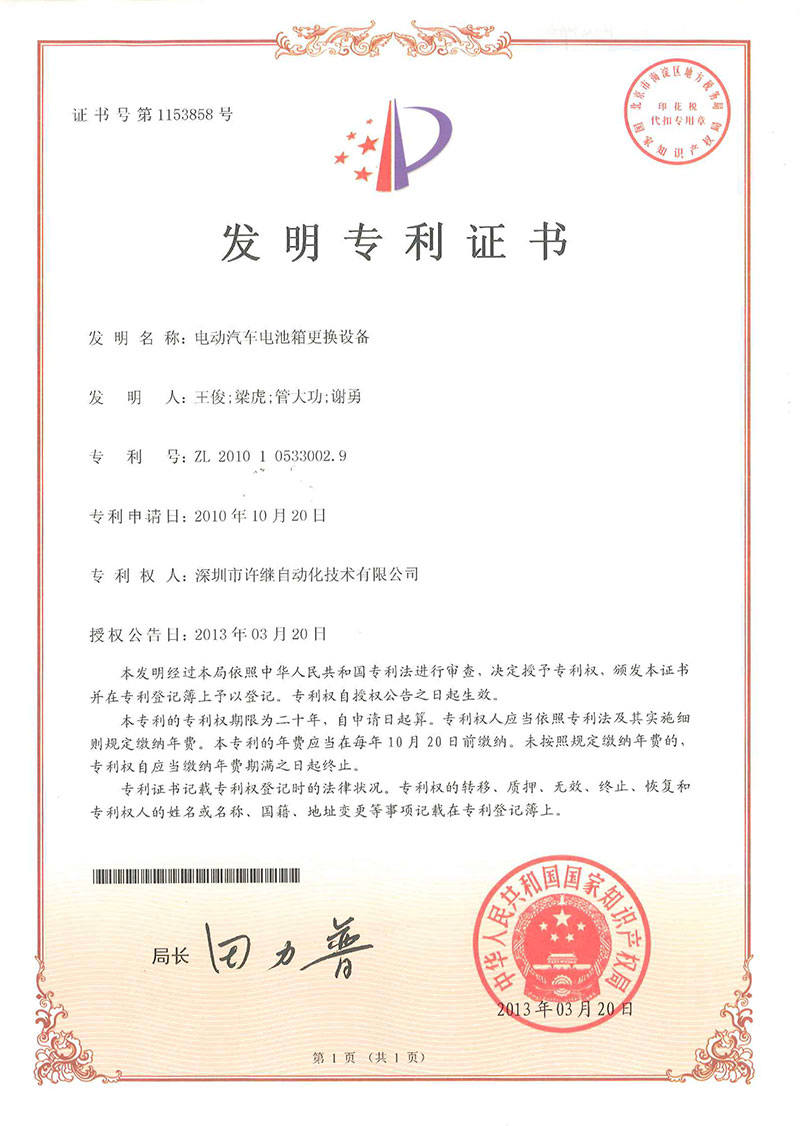 • 電動汽車換電-專利證書