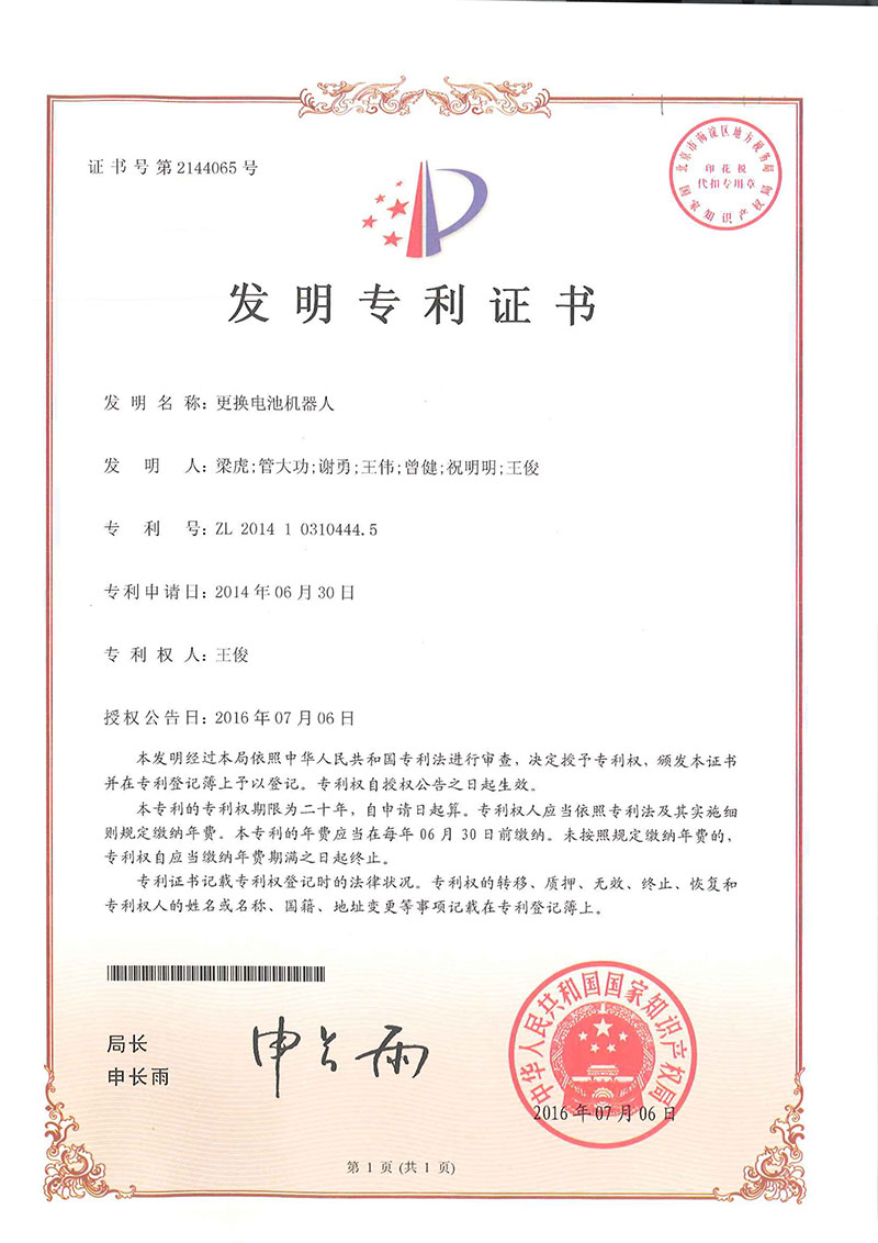 • 更換電池機器人-專利證書