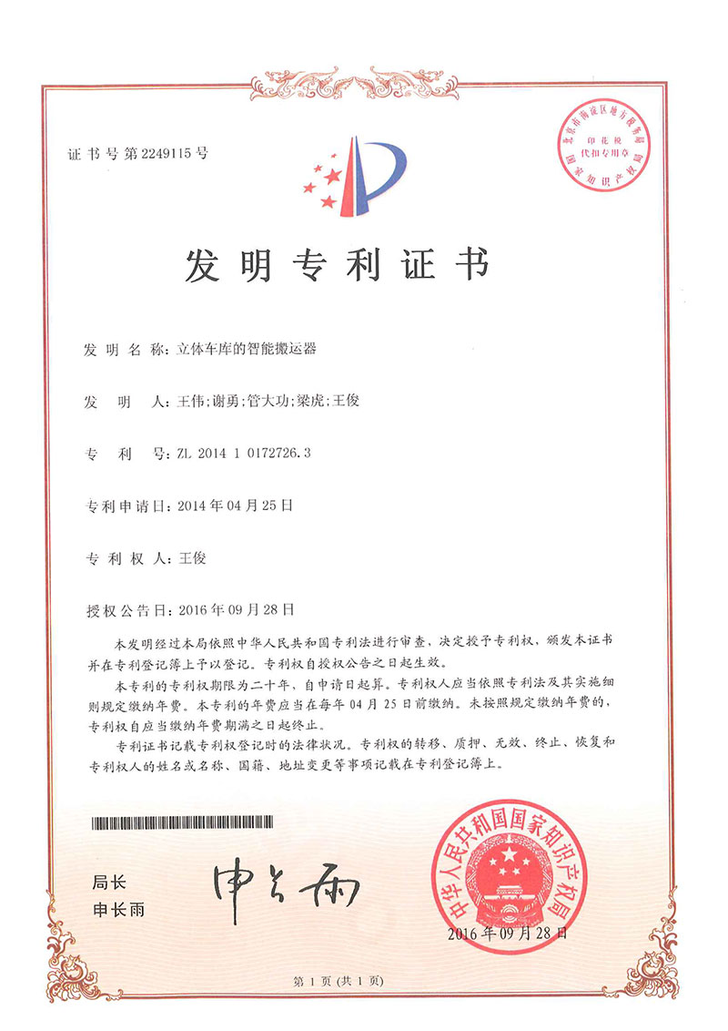 • 立體車庫智能搬運-專利證書