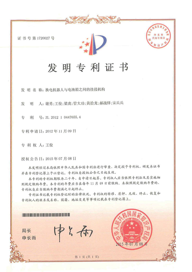 • 換電機器人的維拉系統-專利證書